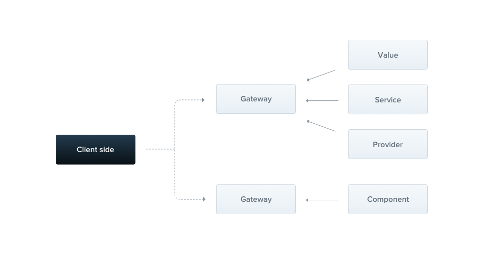 网关可以被视为提供者 ;这意味着它们可以通过类构造函数注入依赖项。同时,网关也可以被其他类(提供者和控制器)注入。
